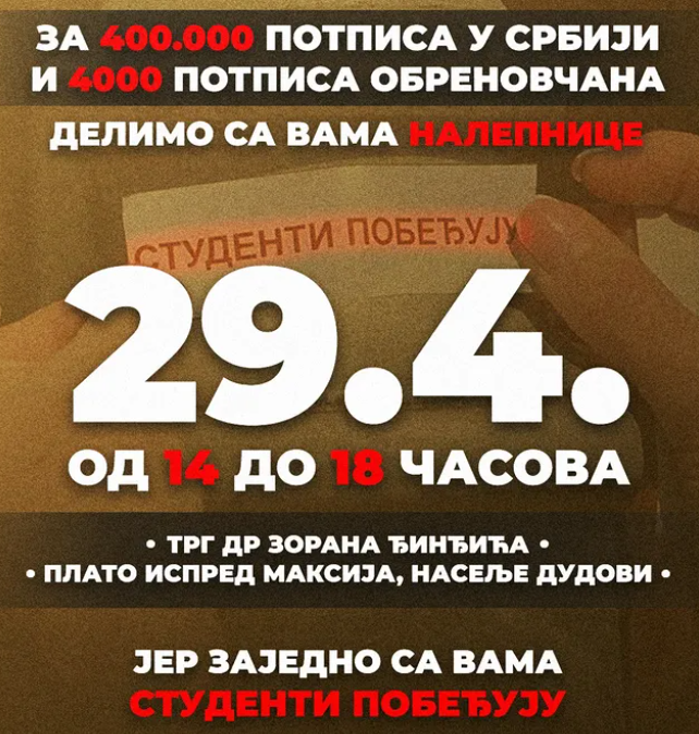 „Dragi ljudi, još jednom smo želeli da vam se zahvalimo za skoro 4000 potpisa skupljenih za samo nekoliko sati u jednom zimskom, prednovogodišnjem danu. Zato vam u sredu, 29. aprila, delimo nalepnice na dve lokacije!”, objavili su u pozivu na svom Instagram nalogu.